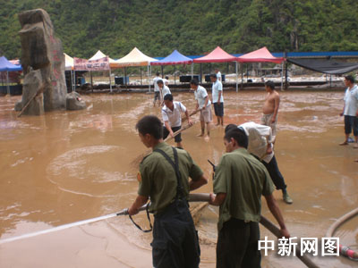 一到現(xiàn)場,消防隊員就立即鋪設(shè)水帶。在專門消防器材的幫助下,消防隊員開始對廣場淤泥進行清理。經(jīng)過艱苦奮戰(zhàn),通往景區(qū)的道路被打通,布滿淤泥的桃花谷廣場終于煥然一新,又露出了昔日干凈美麗的“面龐”。 完