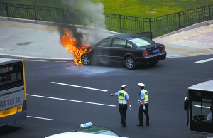 今天9時(shí)30分,(北京市)建國(guó)門(mén)內(nèi)大街由東向西方向,一輛行駛中的黑色帕薩特車(chē)突然自燃,所幸無(wú)人受傷。