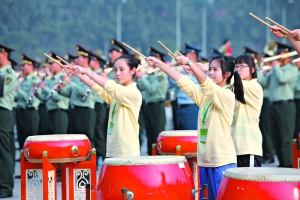 昨日下午3點開始,聯(lián)合軍樂團和合唱團、民族打擊樂團共4000余人在聯(lián)合軍樂團駐地進行了合練。記者在現(xiàn)場看到,廣場樂聲悠揚,氣氛熱烈。一些大學生合唱團成員從各自高校乘大巴趕至郊外,有些學生暈車剛吐完就上場加入合練。