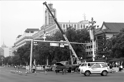 為保證來自四面八方的彩排隊(duì)伍能順利入場、退場,昨天下午,相關(guān)部門對彩排隊(duì)伍必經(jīng)路段上的橫臂式信號燈進(jìn)行暫時(shí)拆除,因?yàn)榇祟愋盘枱艟哂兄笓]四面交通的功能,體積稍顯龐大,在有大規(guī)模的游行隊(duì)伍通過時(shí),會造成不便。