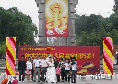 中新網(wǎng)成都10月1日電 (劉賢) 今日上午,成都浣花溪公園迎來(lái)了多對(duì)新人。他們有的身穿婚紗西服,有的則穿著傳統(tǒng)的紅色唐裝旗袍,紛紛在公園門前的“偉大的中華人民共和國(guó)”海報(bào)合影。這些新人表示,他們選擇在今天拍照,是因?yàn)榘炎鎳?guó)六十歲生日與結(jié)婚紀(jì)念日合為一天更有紀(jì)念意義。(完)