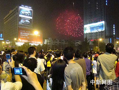 當(dāng)晚8時,早已準(zhǔn)備就緒的禮花彈在成都市區(qū)內(nèi)6個燃放點同時升空,綻放的焰火無比璀璨,給成都夜空披上了一件華麗的袍子。成都民眾紛紛走出家門,來到自家的樓頂或聚集在鬧市區(qū),共賞了這臺慶祝新中國60華誕的焰火“盛筵”。