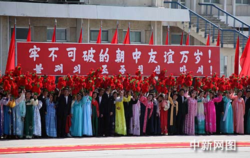 溫家寶一行乘車前往平壤市區(qū)途中,數(shù)十萬平壤市民身著節(jié)日盛裝,揮舞中朝兩國國旗、花束和標(biāo)語,高呼中朝友好口號,夾道歡迎。溫家寶在金英日陪同下,站在敞篷汽車上向歡迎群眾揮手致意,并多次下車,與他們握手。車隊(duì)途經(jīng)平壤凱旋門時(shí),朝鮮少先隊(duì)員向溫家寶敬獻(xiàn)鮮花,并給溫家寶系上紅領(lǐng)巾。