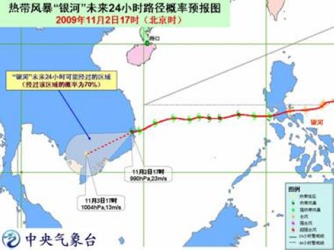 中新網(wǎng)11月2日電 中央氣象臺2日18時(shí)發(fā)布臺風(fēng)預(yù)報(bào):今年第21號強(qiáng)熱帶風(fēng)暴“銀河”的中心已于2日16時(shí)前后在越南富安省(PhuYen)與慶和省(KhanhHoa)交界附近沿海登陸,登陸時(shí)中心附近最大風(fēng)力有10級(25米/秒),中心最低氣壓為985百帕。登陸后,“銀河”減弱為熱帶風(fēng)暴,17時(shí)其中心位于越南慶和省境內(nèi),就是北緯12.8度、東經(jīng)109.1度,中心附近最大風(fēng)力有9級(23米/秒),中心最低氣壓為990百帕。