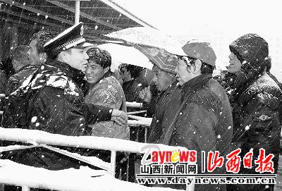 11月10日,一場暴雪給出行的人們帶來了不便。太原交警支隊迅速啟動冰、雪、霧惡劣天氣應(yīng)急預案,全警動員,全員上路,保障人們的出行安全。在大南門崗,太原市公安局副局長、交警支隊支隊長尹喜平在大雪中疏導著,并不時地喊話,提醒大家注意安全。杏花嶺交警大隊對轄區(qū)太原市東客站和太原市客運汽車公司駐站管理。古交交警大隊在三岔口和神堂巖執(zhí)勤點及早安排警力,實施交通管制……(記者曹秀娟)