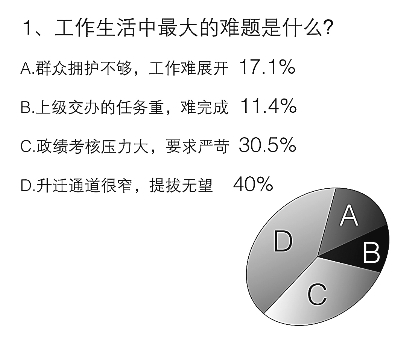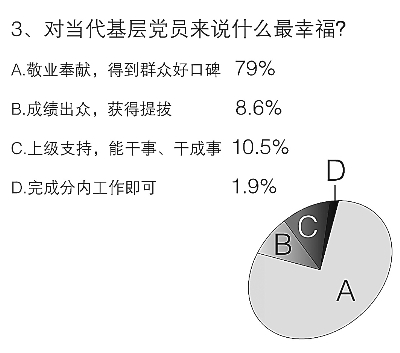 對當(dāng)代基層黨員干部來說,在事業(yè)上什么是最幸福的?根據(jù)調(diào)查,79%的受訪者選擇了“敬業(yè)奉獻(xiàn),得到群眾好口碑”,這說明在基層,群眾工作是最重要的方面。也有10.5%的干部更希望得到“上級支持,有一個(gè)‘能干事,干成事’的氛圍”。