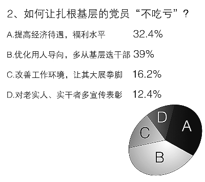 基層比較艱苦,基層比較復(fù)雜,被問到“如何讓扎根基層的共產(chǎn)黨員‘吃苦不吃虧’?”時(shí),39%的受訪者更關(guān)注用人導(dǎo)向問題,他們認(rèn)為應(yīng)該優(yōu)化用人導(dǎo)向,多從基層選拔領(lǐng)導(dǎo)干部;選擇提高經(jīng)濟(jì)待遇,福利水平的也占到了32.4%;值得注意的是,“更重視基層,改善工作環(huán)境,讓其大展拳腳”也受到關(guān)注,有16.2%的受訪者選擇了該選項(xiàng)。