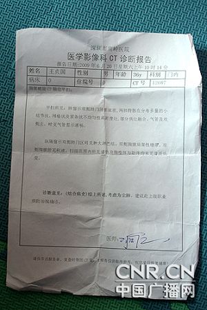 企業(yè)無良、老板心黑,但醫(yī)生被稱為白衣天使,醫(yī)院不能見死不救。炮工們只能對(duì)醫(yī)院拋出一線希望。近幾個(gè)月來,他們?cè)啻蔚缴钲谑新殬I(yè)病院苦苦求助,希望醫(yī)院領(lǐng)導(dǎo)能予以幫助檢查,但依然沒有結(jié)果。炮工們說,他們先后去過4次醫(yī)院,每次的結(jié)果都是一樣:第一次去是一個(gè)主任接見我們的,他就很明確的說你們要檢查這個(gè)我做不了主,就是說政府要答應(yīng)了,才能給我們檢查。第二次去的時(shí)候,醫(yī)院也說不能給我們檢查,他說政府說沒有把公司的委托書給我們,你們要把手續(xù)辦好了才能檢查。第三次去的時(shí)候一直到晚上8點(diǎn)多,那個(gè)院長(zhǎng)一直不出來接見我們,最后派出所的所長(zhǎng)說你們先回去,星期一一定會(huì)給你們一個(gè)明確的答復(fù)的。禮拜一再過去,這是第四次,醫(yī)院說你們還是不能檢查。