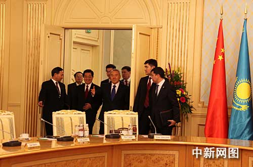 會談前,胡錦濤和納扎爾巴耶夫共同出席中哈天然氣管道竣工儀式。會談后,兩國元首在總統(tǒng)府內(nèi)見證了雙方合作文件的簽署,并共同會見記者。