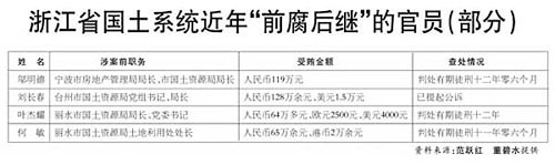 在經(jīng)濟并不發(fā)達,但房價直逼發(fā)達城市的麗水,除市國土局原局長葉杰耀、土地利用處原處長何敏,檢察機關(guān)從國土系統(tǒng)與房地產(chǎn)商之間的權(quán)錢交易中,先后查處了景寧縣兩任國土局長陳守霖、沈永明,麗水市國土局蓮都區(qū)分局原副局長魏興等13件13人賄賂案件,以及麗水國土勘察院貪污受賄窩案。其中2009年11月27日被一審判處有期徒刑十九年的麗水市國土勘察測繪規(guī)劃院原院長鄭宏峰貪污225萬元、受賄150萬元,涉案金額創(chuàng)下了麗水歷史上的新高,被稱為“麗水貪腐第一案”。