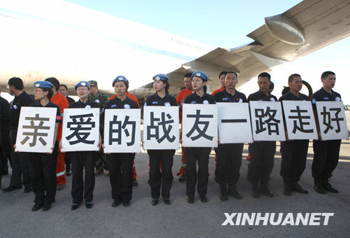 當(dāng)?shù)貢r(shí)間1月17日上午,海地太子港機(jī)場(chǎng)。在戰(zhàn)友們依依不舍的目光注視下,8名在地震中遇難的中國(guó)維和人員的靈柩被送上中國(guó)南方航空公司的一架包機(jī),啟程回國(guó)。