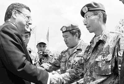 當(dāng)?shù)貢r間昨天中午,中國第十批赴剛果(金)維和醫(yī)療、工兵分隊聯(lián)合舉行盛大儀式接受聯(lián)剛團(tuán)授勛。聯(lián)剛團(tuán)最高官員、聯(lián)合國秘書長潘基文特別代表阿蘭多斯專程從金沙薩趕到布卡武的中國半島,親手為中國維和官兵頒授聯(lián)合國和平勛章。據(jù)悉,這種聯(lián)剛團(tuán)最高規(guī)格的授勛儀式,在布卡武任務(wù)區(qū)各國維和分隊中尚屬首次。中國駐剛果(金)大使吳澤獻(xiàn)和武官畢京三也從剛果(金)首都趕來參加這一儀式。