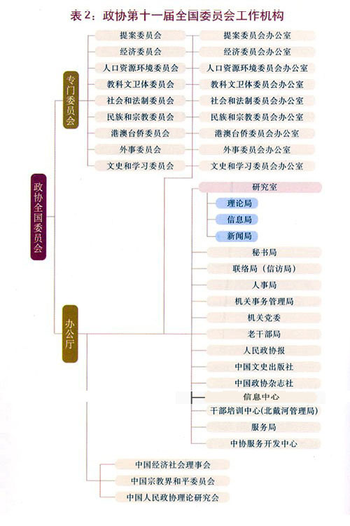 全國委員會設(shè)辦公廳,在秘書長領(lǐng)導下進行工作;設(shè)副秘書長若干人,協(xié)助秘書長進行工作。政協(xié)第十一屆全國委員會工作機構(gòu)如表2。