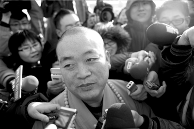 每次人大代表“走紅地毯”時,圓臉方耳、身穿黃色袈裟、足蹬黑色布鞋的全國人大代表、少林寺方丈釋永信一出現在廣場上就會被記者團團包圍,“方丈,聽說你開越野車”“方丈,你現在是住在大別墅了吧?”……面對大家拋出的各種問題,他不急不惱,邊低聲念“阿彌陀佛”邊試圖向密不透風的人墻外移動。見叱咤少林寺的大師卻被眾人圍堵得步履維艱,好事者喊了句“大師,用輕功啊”!大師就是大師,面對記者們刁鉆的問題,他往往用微笑代替回答,“我知道,就算我不說話,也會成為新聞”。
