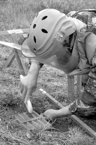 筆者在現(xiàn)場(chǎng)看到,頭戴防護(hù)面罩、身穿厚厚的防護(hù)服的掃雷作業(yè)手,時(shí)而彎著腰用探雷器來回探測(cè),用噴漆或小紅旗做好標(biāo)示,時(shí)而雙膝跪在地上用掃雷專用工具進(jìn)行挖掘,幾乎是以厘米的進(jìn)度向前推進(jìn)。