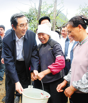 22日一早,馬飚一行趕赴那坡縣視察災(zāi)情、慰問(wèn)群眾。在龍合鄉(xiāng)信合村果三屯,馬飚仔細(xì)詢問(wèn)人畜飲水情況,“村里有多少口人?一天供應(yīng)多少水?”當(dāng)?shù)馗刹繄?bào)告說(shuō),屯里有74戶363人,家家都發(fā)有“送水愛(ài)心服務(wù)卡”,包點(diǎn)干部、送水車主的電話一清二楚,方便群眾聯(lián)系,目前能夠滿足每人每天20公斤水的要求。馬飚聽(tīng)后連連頷首,要求重點(diǎn)關(guān)注困難群眾,確!安宦┮淮、不漏一屯、不漏一戶、不漏一人”?吹饺罕娞嶂魇礁鳂拥乃芭抨(duì)接水,馬飚親切地走上前去為群眾灌水、搬水,一邊忙碌一邊安撫群眾:“慢點(diǎn)慢點(diǎn),不要著急?拷恍,灑了浪費(fèi)!逼潞舌l(xiāng)善合村地下抽水點(diǎn)從2月初開始發(fā)揮作用,累計(jì)已運(yùn)送生活用水6000多噸。馬飚跳到地洞口前仔細(xì)查看水源情況,聽(tīng)說(shuō)這里每天可以抽取200多噸優(yōu)質(zhì)地下水供附近群眾使用,馬飚非常高興。他要求組織更多人員尋找抗旱水源,有效緩解用水緊張。在距離縣城8公里遠(yuǎn)的那馬溝,馬飚聽(tīng)取了縣城應(yīng)急供水工程規(guī)劃匯報(bào)。他不顧場(chǎng)地濕滑泥濘,親自下到正在施工的攔水壩前,仔細(xì)察看施工場(chǎng)地和管材,與工人們一起搬運(yùn)石料和漿桶,他強(qiáng)調(diào)說(shuō):“應(yīng)急工程既要趕時(shí)間保應(yīng)急,更要講科學(xué)重質(zhì)量,必須對(duì)群眾負(fù)責(zé),確保3月30日前能用上!痹谀瞧驴h自來(lái)水廠,當(dāng)聽(tīng)說(shuō)城區(qū)每天供水量?jī)H1800立方米,只能分段供應(yīng)4個(gè)小時(shí),遠(yuǎn)低于最低保障用水量時(shí),馬飚神情凝重。他叮囑水廠干部職工,“保供水就是保穩(wěn)定。自治區(qū)黨委、政府非常關(guān)心那坡縣城的供水難問(wèn)題,你們責(zé)任重大,一定要做好水源調(diào)度和管理,保證縣城正常生活用水!