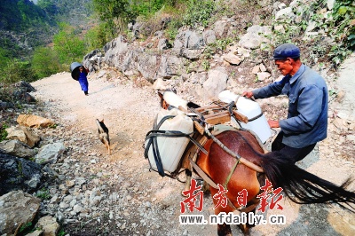 因為山路崎嶇,龍合鄉(xiāng)許多村民都養(yǎng)馬輔助運輸,每次可以運回兩小罐水!暗翘珊,村里已找不到草給它們吃,馬匹都要放開一段時間,讓它們自己覓食”,原來有十幾匹馬的果林屯,昨天能夠來接水的只有三匹馬,“村里有一匹老馬,為主人家送水外還幫五保戶送水,連續(xù)操勞了幾個月,幾天前累倒死了”,鄉(xiāng)長和不少村民告訴記者這一“奇聞”。