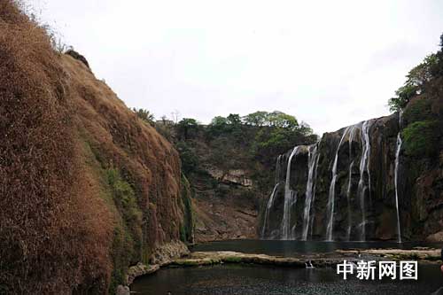 進入景區(qū),看見一小潭碧水緩流,走過兩座索橋,便見到了聞名遐邇的黃果樹瀑布,遠遠望去,十幾股細流從崖上留下,在懸壁裸露嶙峋的石間撞擊穿梭,形成小小的瀑面,卻全然擋不住崖壁的黑青色,與往日“萬里水匯一水大,訇訇聲聞十里外”的景色相去甚遠。而在瀑布左岸,一壁的昏黃枯草更顯得觸目驚心。