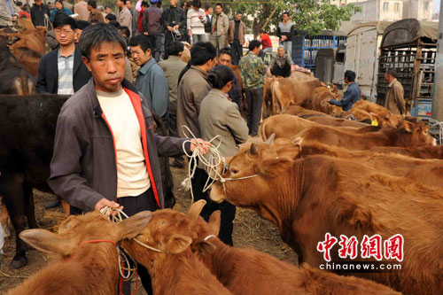 秦大章夫婦看上了馮元達一頭不到兩歲的小牛,“沒換牙齒、蹄也不錯!鼻卮笳潞軆刃械母嬖V記者。在此后近30分鐘的時間里,一場在2300元至1900元人民幣之間的價錢拉鋸戰(zhàn)進行起來。最終,在周邊人的撮合下,秦大章以2010元的價錢買到了他看上的小牛。
