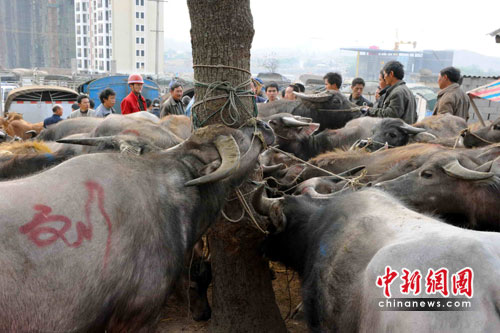 近中午時間,市場里買賣的人群還未散去。秦大章夫婦牽著剛買的;丶伊耍@得花上2、3個小時的時間。回到家,喂牛的水又是一個問題,“沒干凈水夠它喝,只能像鄰居那樣把洗菜、洗臉腳的水留下給牛喝!鼻卮笳碌钠拮诱f。雖然羨慕村里有人可以用機器耕地,但家里的4、5畝地多在石頭叢生的半山腰上,秦家夫婦還是只能選擇最傳統(tǒng)的牛耕方式。