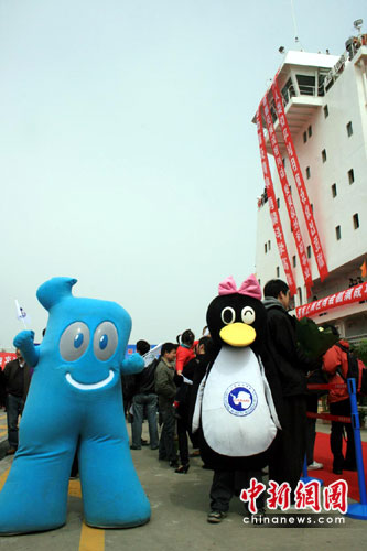 記者從上海外高橋邊檢站獲悉, 此次“雪龍”號(hào)凱旋,也從南極帶回了極地科考人員對(duì)上海世博會(huì)的祝福。在“雪龍”號(hào)的艦載直升機(jī)旁,有一個(gè)可愛(ài)的海寶,外高橋邊檢站民警告訴記者,這個(gè)海寶隨“雪龍”出征,全程見(jiàn)證了我國(guó)的第26次南極科考。