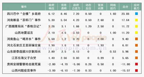 人民網(wǎng)輿情監(jiān)測室今天發(fā)布了“2010年第一季度地方應(yīng)對網(wǎng)絡(luò)輿情能力排行榜”,對2010年第一季度地方黨政機關(guān)應(yīng)對輿情熱點事件的得失進行考評。四川巴中“全裸”鄉(xiāng)政府因為在信息透明度、政府公信力等指標(biāo)上一枝獨秀,進入總體較為得體的藍色區(qū)域,而貴州安順警察槍擊致死案、山西問題疫苗事件則被判定為應(yīng)對嚴(yán)重失當(dāng),被亮起“紅色警報”,值得反思。中國人民大學(xué)公共政策研究院執(zhí)行副院長毛壽龍教授在點評山西疫苗事件時就指出“問題一個系統(tǒng)又一個系統(tǒng)的出,再一個系統(tǒng)一個系統(tǒng)地去治理,顯然不是一個好辦法。所以,現(xiàn)在是各個領(lǐng)域都需要很好重視的時候了”。