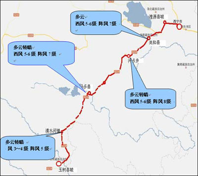 青海省氣象局預(yù)計(jì),今天白天到夜間,青海全省各地多云或晴,其中海南、果洛北部有6到7級(jí)西風(fēng),海南的部分地區(qū)有沙塵天氣。沿途天氣對(duì)前往玉樹震區(qū)救災(zāi)車輛會(huì)有一定影響,請(qǐng)前往災(zāi)區(qū)的救援人員注意防范。