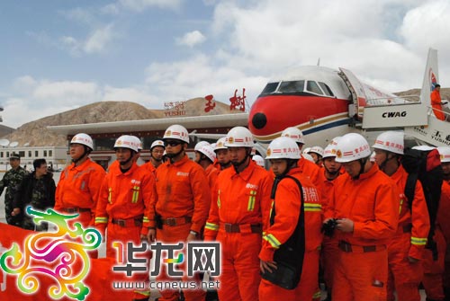 經(jīng)過一個多小時的飛行,首批120名赴青海玉樹地震災區(qū)參加抗震救災的重慶救援隊隊員,于2010年4月15日14時45分,順利飛抵玉樹機場。