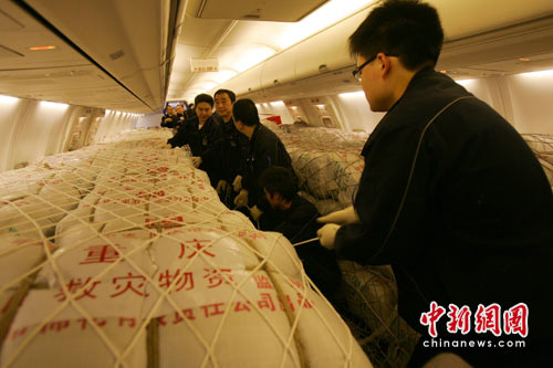 截至15日17時,中共重慶市委、市政府組織的第二批救災(zāi)物資已經(jīng)運抵重慶機場,由國航重慶分公司的波音737-800執(zhí)行飛行任務(wù)準(zhǔn)備運往災(zāi)區(qū)。而重慶機場已在下午開始對首批救援物資進(jìn)行裝載,包括1萬床棉被、2500件棉大衣、3130件防寒服、500件兒童羽絨服、20件應(yīng)急燈和160臺發(fā)電機等。完
