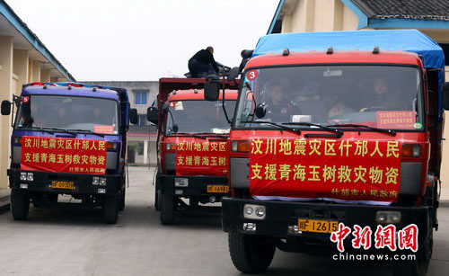 中新網(wǎng)什邡4月16日電(記者楊杰)16日上午,首批3輛滿載著代表“5.12”地震極重災區(qū)什邡人民深情厚誼的捐贈救災物資車輛,從什邡市啟程,開始奔赴青海玉樹災區(qū)。