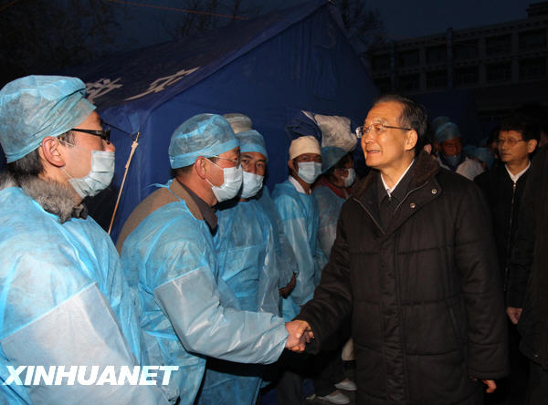 在漸漸沉下的暮色中,溫家寶又來(lái)到玉樹州人民醫(yī)院,走進(jìn)醫(yī)院大院里搭建的帳篷里,看望受傷的群眾。