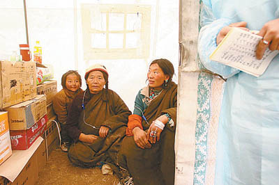 看一看玉樹街頭的人們,你會(huì)五味雜陳。傷感無處不在:小學(xué)生的校服和紅領(lǐng)巾上沾著灰,好像是剛從倒塌的校舍里拋出來的一樣;9歲的孩子抱著爛了一半的梨子不肯撒手;革及著拖鞋的外地女人失神地站在消失了的貨棧面前。但也有些時(shí)候,能遇上剛領(lǐng)了一把掛面的女孩笑呵呵地露出白色牙齒,或是孩子在蓬頭垢面的母親懷里安睡。一個(gè)孤獨(dú)的老婦人牽著一條狗,面色平靜地坐在倒掉的院墻邊上,讓人不禁想起“家園”和“守候”這些詞匯。