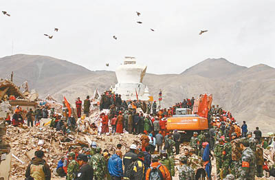 愿意在風(fēng)雪中進(jìn)行一次短暫巡視的人到處都能看到這樣的景象:騎著缺了車燈的摩托車的藏族漢子一臉倦容,他怕家人牽掛而備感焦急,但還是會(huì)對外來的人擠出一絲微笑;5個(gè)年輕人——他們有的還只是高中生——正忙著把自家的廢墟扒開,搬出椅子、飯鍋或者其他可能還完整的東西。很難知道家里的大人在哪里,問起來,他們轉(zhuǎn)過頭去,一臉茫然的神情。