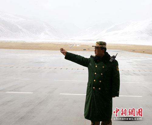 中新網(wǎng)青海玉樹(shù)4月22日電(石磊記者劉忠俊)22日5:10分,青海玉樹(shù)災(zāi)區(qū)陰云密布,天空下起大雪。為確保唯一空中生命線(xiàn)的暢通,武警青?傟(duì)駐巴塘機(jī)場(chǎng)官兵加強(qiáng)機(jī)場(chǎng)安全保衛(wèi)工作。
