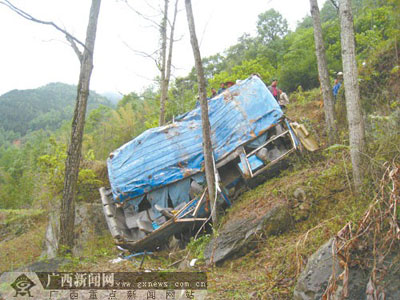 東蘭訊 4月22日上午9時許,一輛由大化瑤族自治縣七百弄鄉(xiāng)開往河池市的客運中巴車,在途經(jīng)東蘭縣花香鄉(xiāng)干來村時突發(fā)機械故障,導(dǎo)致車輛滾下90米長陡坡(垂直高度40米)。事故造成車上7名乘客先后死亡,35人不同程度受傷。