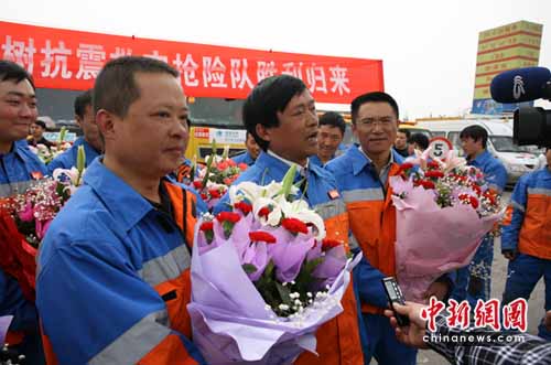 中新網(wǎng)成都4月26日電(記者劉忠俊)26日,國家電網(wǎng)四川省電力公司電力抗震救災(zāi)搶險(xiǎn)隊(duì)安全從地震災(zāi)區(qū)玉樹返蓉。該支抗震救災(zāi)搶險(xiǎn)隊(duì)為玉樹災(zāi)區(qū)送去了發(fā)電機(jī)、發(fā)電車以及電力搶險(xiǎn)設(shè)備和救援物資,為玉樹災(zāi)區(qū)災(zāi)民安置區(qū)、學(xué)校復(fù)課提供了充足的電力保障。