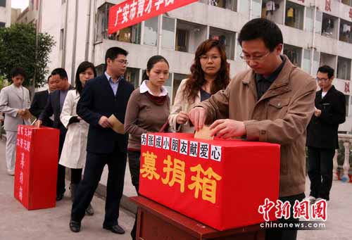 中新網(wǎng)成都4月26日電(廖小兵 王天青 曾一瑩)在“4.14”青海玉樹大地震中,四川廣安區(qū)龍安鄉(xiāng)文林村四組村民張朝清、聶文蘭夫婦雙雙遇難,留下遺孤張成與72歲的奶奶相依為命。消息傳來,愛心如潮,廣安區(qū)各界人士紛紛伸出援助之手。26日8時(shí)許,在廣安城南新區(qū)的育才學(xué)校校園內(nèi),師生們?yōu)榧娂娍犊饽,?dāng)場(chǎng)收到捐款15100.90元。