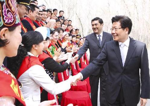 29日下午,在“五一”國際勞動節(jié)即將來臨之際,自治區(qū)黨委書記張春賢等領(lǐng)導(dǎo)與參加2010年全國勞動模范和先進(jìn)工作者表彰大會載譽歸來的我區(qū)全國勞動模范和先進(jìn)工作者舉行座談,共話新疆美好的明天。他強調(diào),要在全社會弘揚勞模精神,凝聚廣大職工群眾的智慧和力量,共同建設(shè)美好新疆。