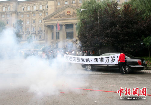 宣判結(jié)果宣布不久,數(shù)十名普通百姓在重慶高級人民法院拉起“判處文強死刑,法律萬歲”的橫幅,并放起鞭炮以示慶祝。