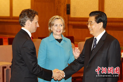 中新網(wǎng)北京5月25日電 (記者 張朔)中國國家主席胡錦濤25日下午在人民大會堂會見來華出席第二輪中美戰(zhàn)略與經(jīng)濟對話的美國國務(wù)卿克林頓和財長蓋特納以及美方部分部長。