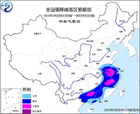 預(yù)計,6月8日20時到6月9日20時,河南南部、湖北東部、安徽、江蘇西部、湖南南部、江西、浙江、福建中北部、廣西、廣東中西部的部分地區(qū)有大到暴雨,其中,安徽南部、江西東北部、福建北部、廣西東北部等地的局部地區(qū)有大暴雨;上述部分地區(qū)還將伴有短時雷雨大風(fēng)等強對流天氣。
