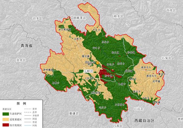 災后恢復重建要與三江源、隆寶自然保護區(qū)規(guī)劃相銜接,根據(jù)資源環(huán)境承載能力綜合評價,將規(guī)劃區(qū)國土空間劃分為生態(tài)保護區(qū)、適度重建區(qū)和綜合發(fā)展區(qū)。