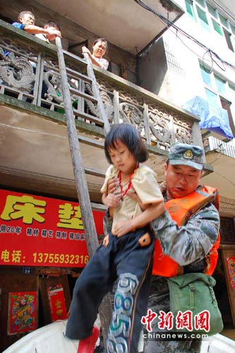 在一棟兩層高的老房子上,兩位老人焦急的招手呼喚救援,謝川江和戰(zhàn)友趕緊將沖鋒舟減速并靠近木樓。老漢姓胡,約有60來歲的樣子,看見解放軍來救援,老人的眼角濕潤了起來。等沖鋒舟停穩(wěn),老漢懸下一幅木梯,先將自己8歲的小孫女和14歲的孫子送上沖鋒艇,隨后再幫助58歲的老伴登上沖鋒艇。待3人坐穩(wěn)以后,胡老漢輕聲的囑咐一聲“你們要注意安全”,隨后朝解放軍戰(zhàn)士揮手致謝。