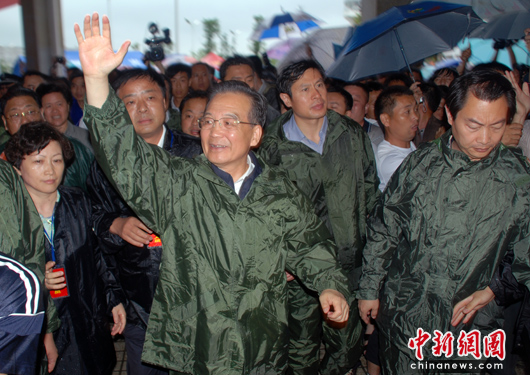 在羅針鎮(zhèn),溫家寶冒雨在羅針鎮(zhèn)高速公路的羅針收費站下車,直接到了險情的岸邊,慰問現(xiàn)場搶險的人員。他和搶險的武警官兵親切握手,并即興發(fā)表了講話。