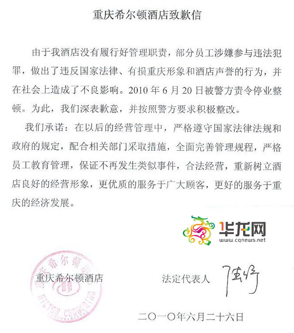 2010年6月20日,重慶希爾頓酒店因股東涉黑,介紹、容留婦女賣淫,違法經(jīng)營(yíng)和故意擾亂社會(huì)秩序,被重慶警方責(zé)令停業(yè)整頓。今日16時(shí)40分,重慶希爾頓酒店法定代表人陸紓,通過(guò)華龍網(wǎng)記者就此事公開(kāi)發(fā)表致歉信,承諾合法經(jīng)營(yíng),更好地服務(wù)重慶經(jīng)濟(jì)發(fā)展。