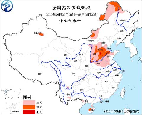 中新網(wǎng)6月28日電 中央氣象臺2010年6月28日06時(shí)繼續(xù)發(fā)布高溫藍(lán)色預(yù)警:預(yù)計(jì),今天白天,內(nèi)蒙古東北部和中部的部分地區(qū)、黑龍江西北部、山西、河北大部、天津、河南中北部、山東中西部、安徽北部、江蘇西北部、廣東雷州半島、海南北部等地有35~37℃、局地38℃的高溫天氣,其中,河北南部的局部地區(qū)最高氣溫可達(dá)40℃。