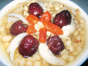 取薏仁米50g、百合15g、粳米100g、蜂蜜適量。將薏仁米、百合、粳米入鍋加水煮至熟爛,入蜂蜜調(diào)勻,出鍋即成。分2次服完。此粥有健脾益胃,澤膚祛斑功效?捎糜谥委煁D女面部雀斑、痤瘡、濕疹等癥,對癰腫、濕瘡有治療效果。