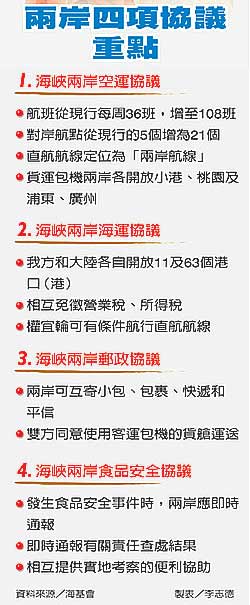 報道說,兩會副董事長、副會長層級協(xié)商昨天敲定空運、海運、郵件及食品安全等四項協(xié)議,今天將由海基會董事長江丙坤及海協(xié)會會長陳云林舉行二次江陳會談,簽署協(xié)議。其中空運、海運、郵件等三項協(xié)議在簽署四十天后生效,食品安全協(xié)議在七天后生效。