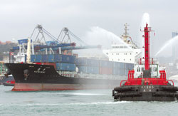 兩岸海運(yùn)15日全面直航。臺灣基隆港務(wù)局在碼頭舉行首航儀式,并派出引水船為首批解纜出航的直航貨輪灑水祝福。(來源:臺灣《中國時報》)