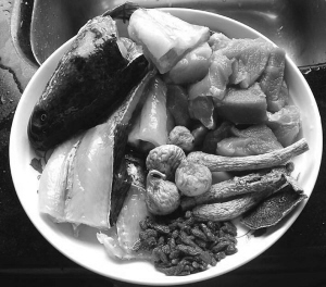 制法:將生魚(yú)洗凈,放入鍋用油煎約7分鐘,再洗干凈備用。將豬肉放入瓦罐用開(kāi)水焯約5分鐘。